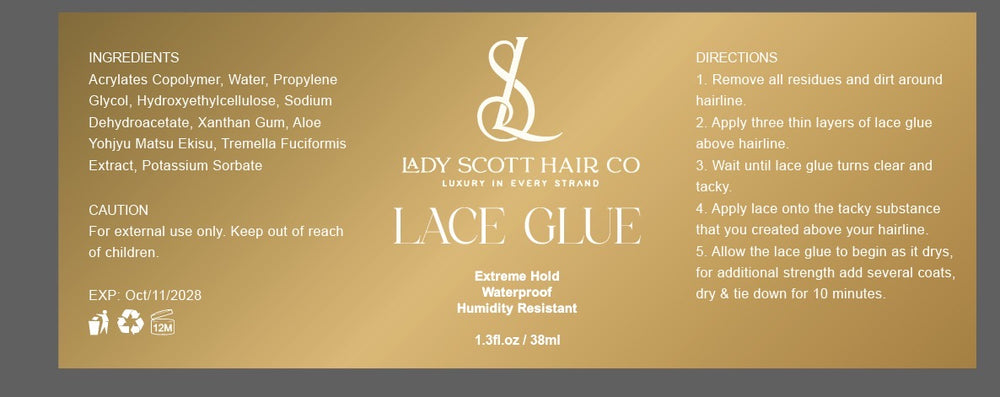 Extreme hold lace glue. This will provide an extremely secure hold for all of your lace products. Apply 2-3 thin layers of glue for +2 weeks hold. Apply 4-5 thin layers of glue for 3-4 week hold. You can go to the gym, swimming and do normal activities without worrying about your lace sliding off. Please remove lace with our glue remover to prevent damage to natural hair. Tag us in your photos #ladyscotthairco